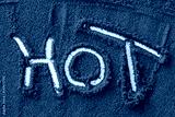 chili red hot pepper, concept of popular spice - on background pattern of dry ground spices written word HOT by the finger of a man, word HOT on background of brown pepper powder, flat lay, top view