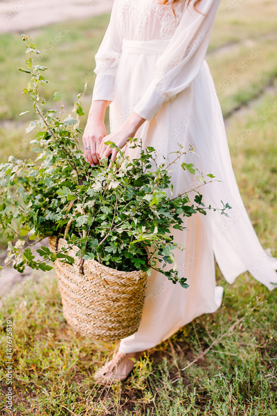 people, holidays and nature concept - young woman in white hold large basket of green branches for decoration, girl florist on the summer field gather herbs for decoration of bouquets and interiors