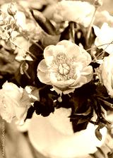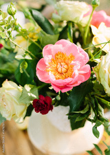 bouquet, holiday flower, gift and floral arrangement concept - top view of pastel bouquet of pink peony and cute roses in white vase, charming summer flowers, selective focus vertical