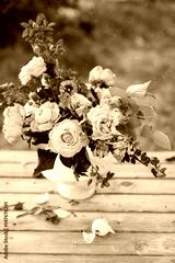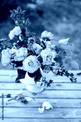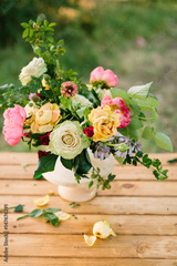 bouquet, holidays flower, gifts and floral arrangement concept - white vase of beautiful yellow and white roses, pink charming peon, carnations, shoots of wild rose, wooden table on green background