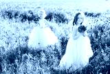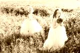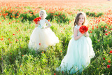 little girl model, fashion concept - two young girls models walking in the countryside, collecting bouquets of meadow flowers, in hands fresh poppies, dressed in fashionable white and blue dresses