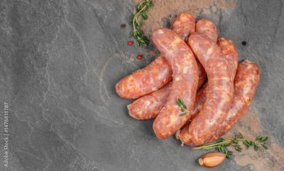 Raw sausages or bratwurst with spices for grill or barbeque on a black stone table, top view