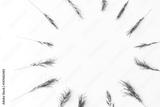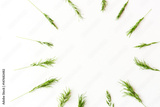 Ears of a green cereal form a pattern of a circle lying on a white background. Concept of healthy lifestile, organic food, freshness and spring mood. minimalistic picture of the ripening harvest.