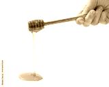 wooden honey dipper with golden honey dripping