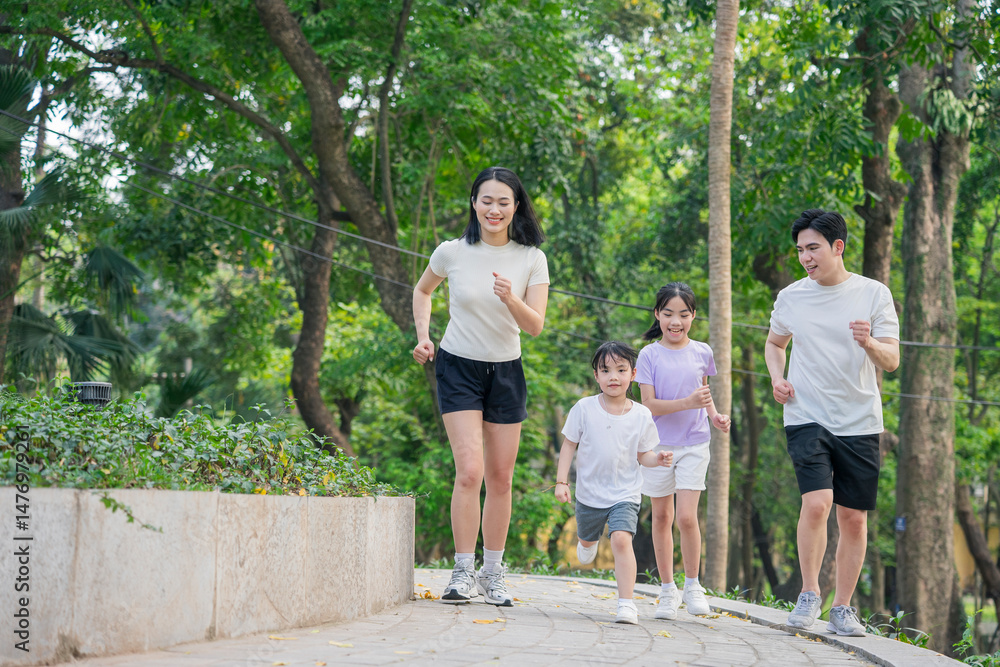 Family enjoying a morning jog through a lush park surrounded by green trees and nature