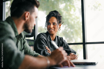 Group of young multi-ethnic startup business team collaborating on project in modern office