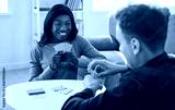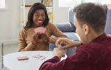 Multiracial young couple, interracial family at home playing card game at desk, pretty african american woman and caucasian man boyfriend gives high five to celebrate victory, feel happy, resting