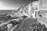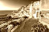 Scenic view of traditional cycladic houses on small street with flowers in foreground, Oia village, Santorini, Greece. Sunset view point. Holidays background.