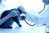 Appointment at veterinary clinic, professional male working on examination table with cat owner and examining little kitten in animal hospital