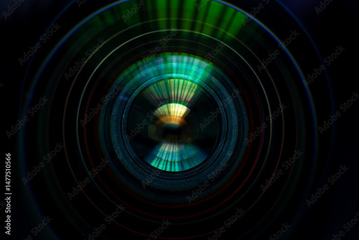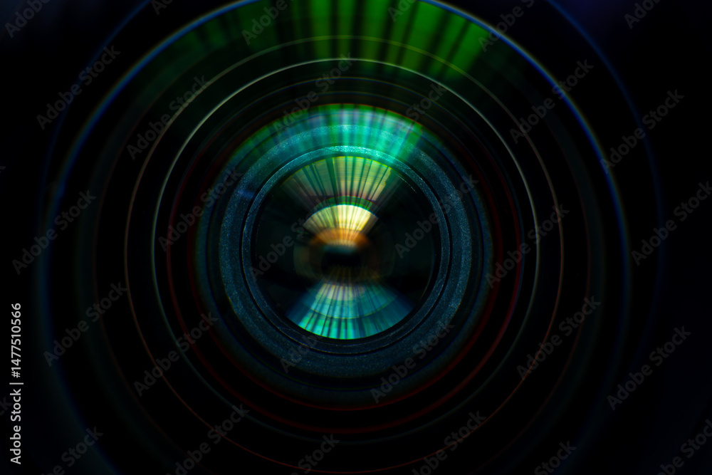 Close-up macro lens,Photo or video camera lens with light reflections close-up on the black background.