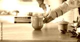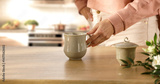 Woman Making Tea in Cozy Kitchen – Warm Morning Light and Home Atmosphere. Peaceful moment in a warm, naturally lit kitchen. home comfort, and mindful daily rituals. Copy space.