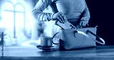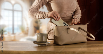 Female Hands Packing Purse at Desk – Workday Morning Routine. Copy space and business lifestyle, productivity, work from home, or daily routines concept.