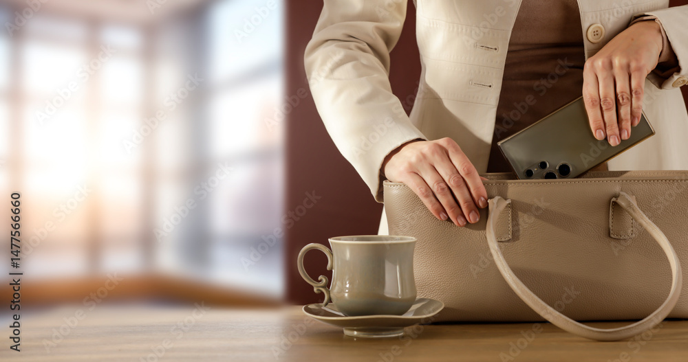 Female Hands Packing Purse at Desk – Workday Morning Routine. Copy space and business lifestyle, productivity, work from home, or daily routines concept.