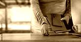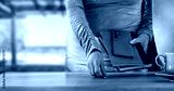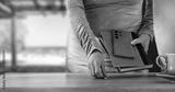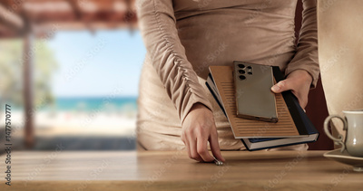 Female Hands Packing Purse at Desk – Workday Morning Routine. Copy space and business lifestyle, productivity, work from home, or daily routines concept.