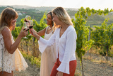 Female friends tasting wine with vineyard and sunset in background - Happy women cheering with red vine outdoor during summer time