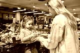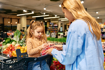 Little girl excitedly taking cherry tomatoes from her mom in grocery store