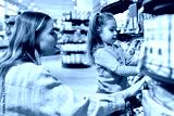 Little girl choosing item from supermarket shelf with guidance from her mother