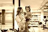 Smiling mother and daughter holding a pineapple in supermarket produce section