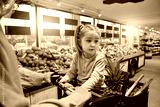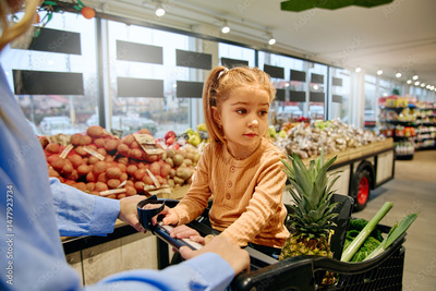 Thoughtful Little Girl Sitting in Shopping Cart Near Fresh Produce in Grocery Store
