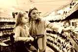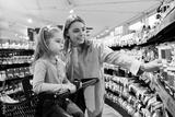 Mother and daughter choosing products together while grocery shopping in supermarket
