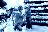 Mother gently touching daughter nose while smiling in supermarket snack aisle