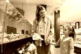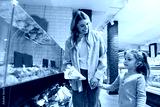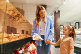 Happy mother and daughter holding hands while shopping at bakery section in supermarket