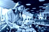 Smiling woman choosing ripe yellow tomatoes at organic grocery store