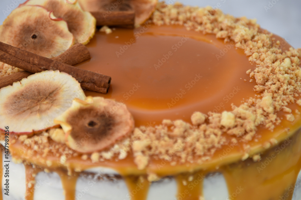 Elegant Caramel Fig Drip Cake featuring layers of moist cake drizzled with rich caramel, topped with dried fig slices, and chopped nuts isolated on grey background closeup side view of baked dessert