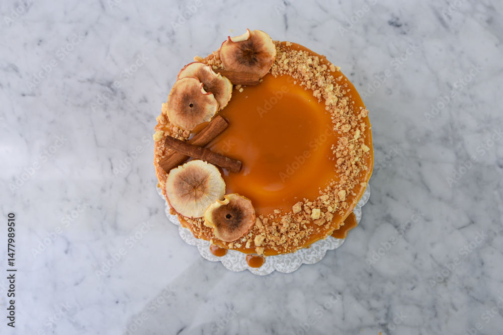 Elegant Caramel Fig Drip Cake featuring layers of moist cake drizzled with rich caramel, topped with dried fig slices, and chopped nuts isolated on grey background top view of baked dessert