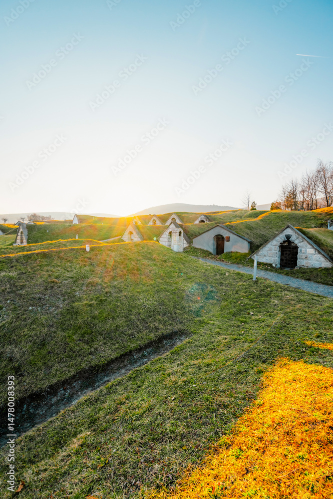 Traditional wine cellars in Hercegkut near Sarospatak Tokaj region Hungary. Button Hill.