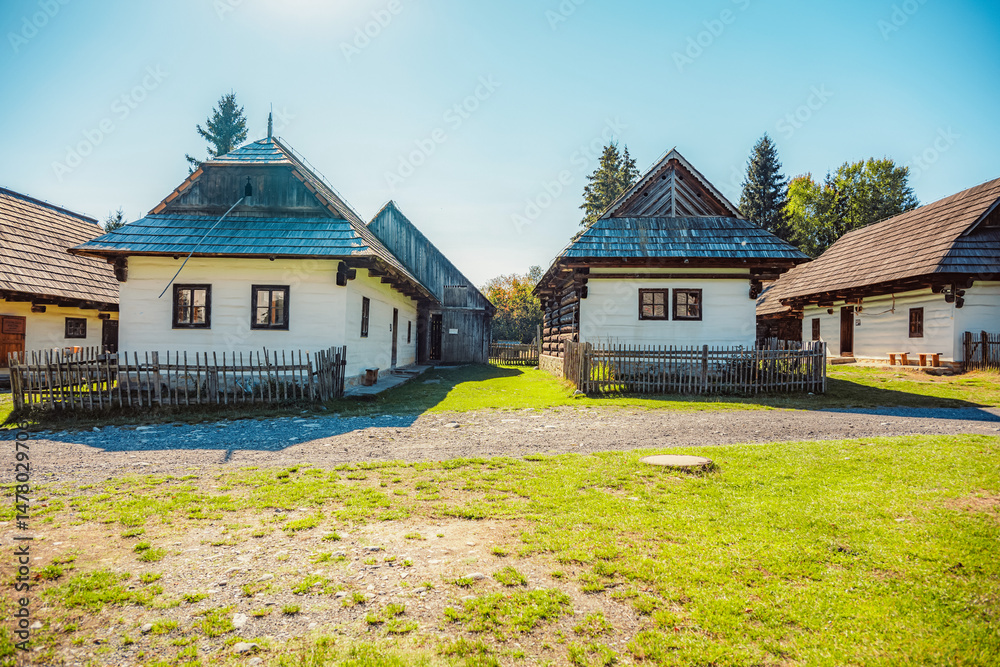 Rare wooden bell tower with folk houses located in open-air museum of Liptov Village, Slovakia - Pribylina