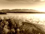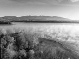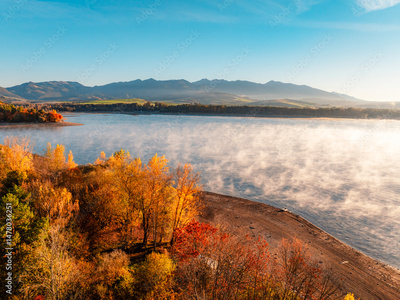 Liptov region with Tatras mountains around. Liptovska mara dam landspace. Autumn deciduous forest view from above