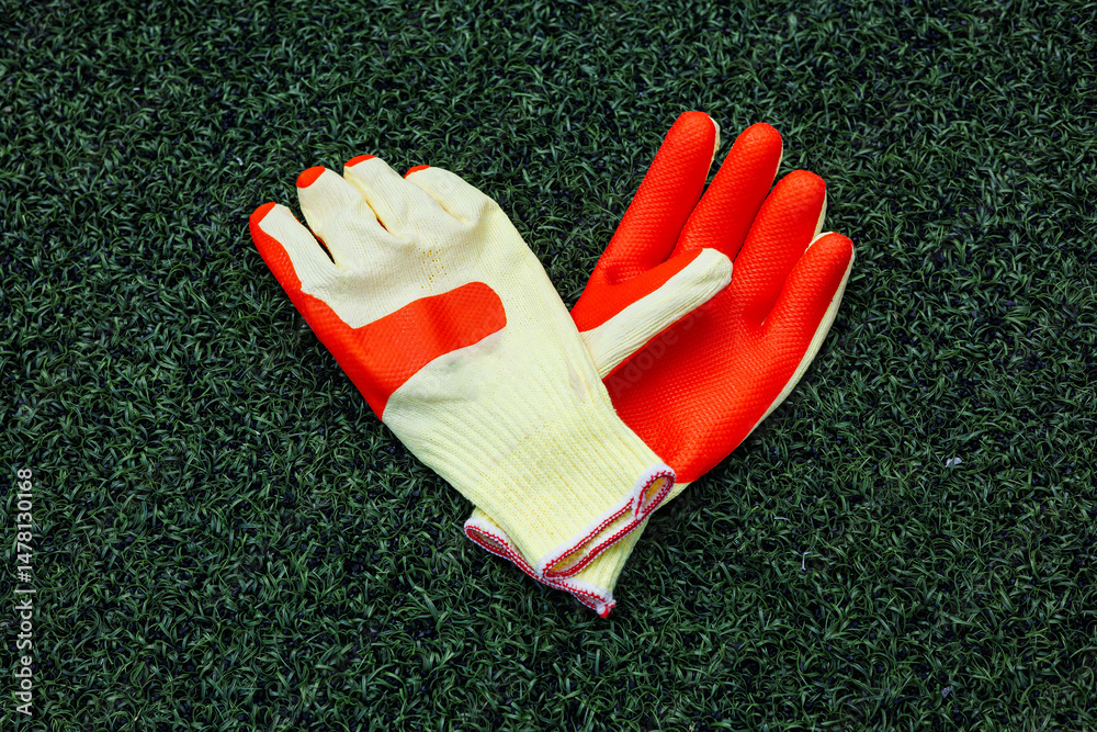 These vibrant and colorful gardening gloves stand out beautifully against the lush green turf, making them perfect for outdoor work, providing excellent protection and comfort for all gardening tasks