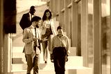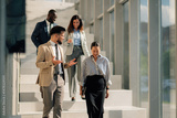 Business people walking down stairs in modern office building