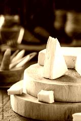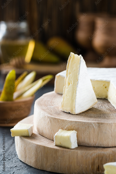Soft cheese brie sliced on wooden cuts with honey and pear on dark rustic background