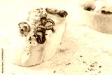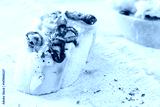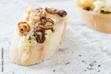 Baguette slices with homemade cheese dip made of French soft cheese from Brittany region or brie, caramelized onions and dried herbs. Hearty snack on cloth background
