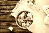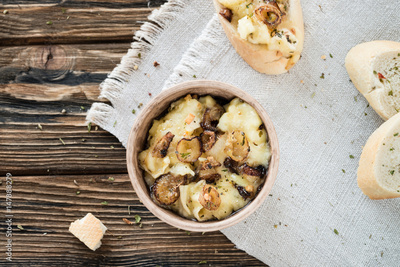 Homemade cheese dip made of French soft cheese from Brittany region or brie, caramelized onions and dried herbs served with baguette slices, top view. Hearty snack on dark wooden background