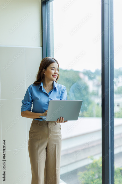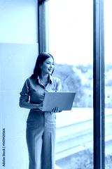 Attractive asian woman, Manager with laptop stands in office area of coworking space