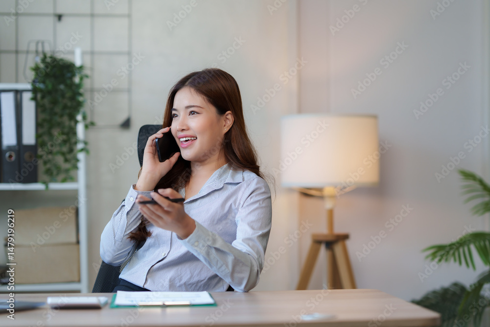 Smiling businesswoman talking on phone and reading notes in office