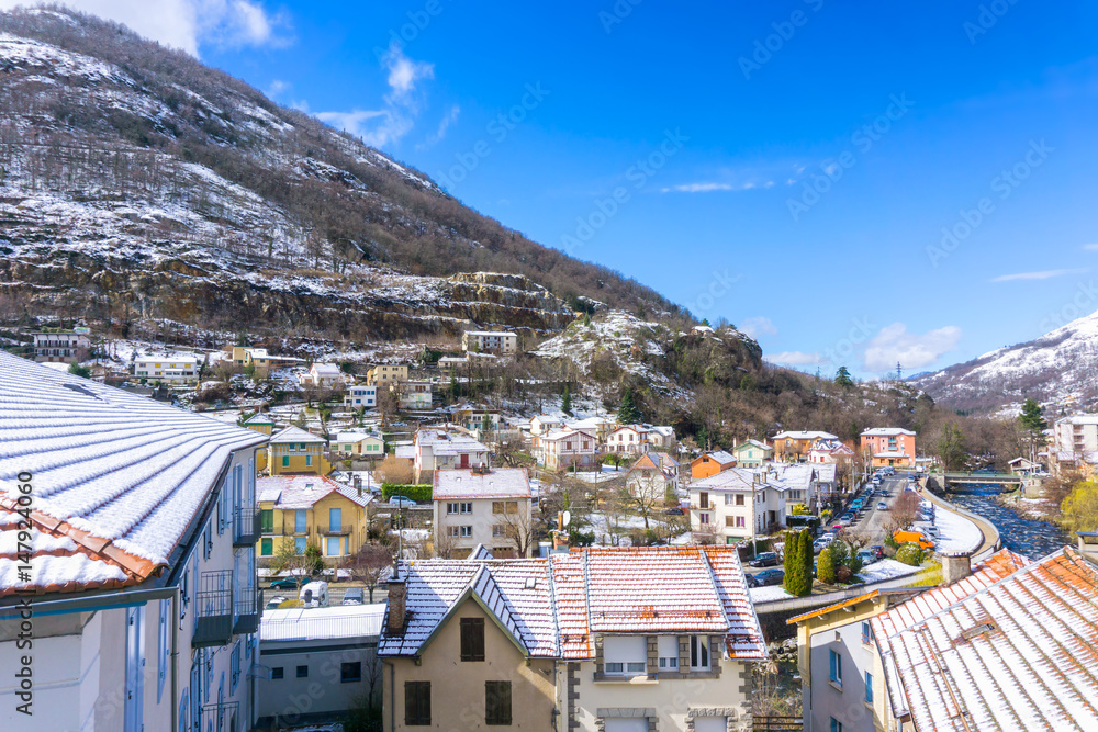 Apartments and hotel of French mountain ski resort in summer sunny day, Ax-les-Thermes, France