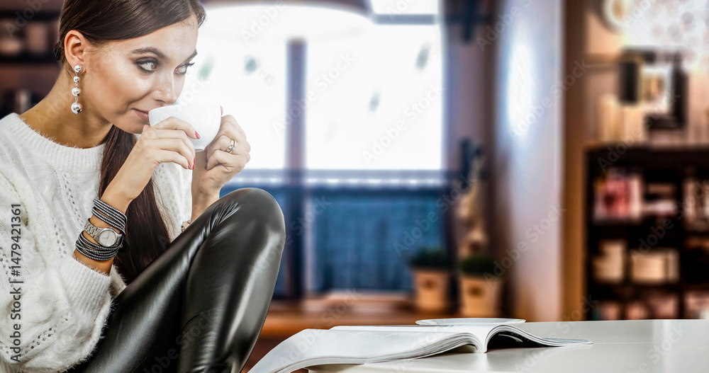 Young Woman Enjoying Coffee in Cozy Kitchen – Morning Relaxation at Home. Morning routine, home lifestyle, self-care, slow living, and coffee enjoyment concept.