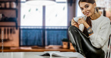 Young Woman Enjoying Coffee in Cozy Kitchen – Morning Relaxation at Home. Morning routine, home lifestyle, self-care, slow living, and coffee enjoyment concept.