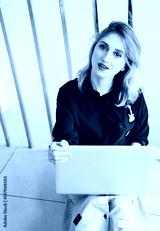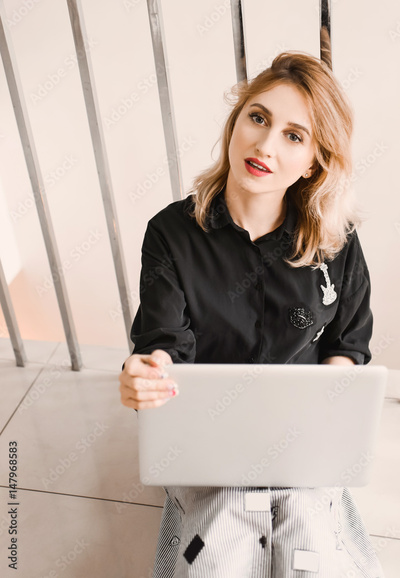 Girl young beautiful blonde hipster with red lips inside in black blouse holds smart laptop tablet using on keyboard