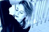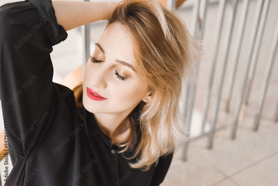 Girl young beautiful blonde hipster with red lips expressive eyes inside posing in black blouse
