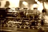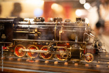 Detailed close-up of an antique model steam locomotive, showcasing intricate details and craftsmanship.