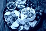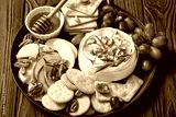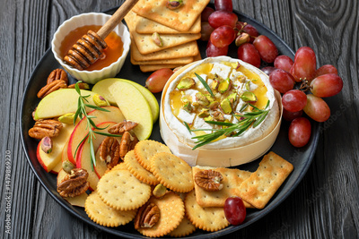 Baked Camembert with honey, pistachios, top view
