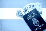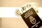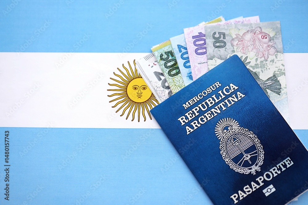Argentine pesos money bills in big amount and passport lies on Argentina flag close up