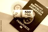 Argentine pesos money bills in big amount and passport lies on Argentina flag close up