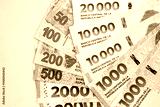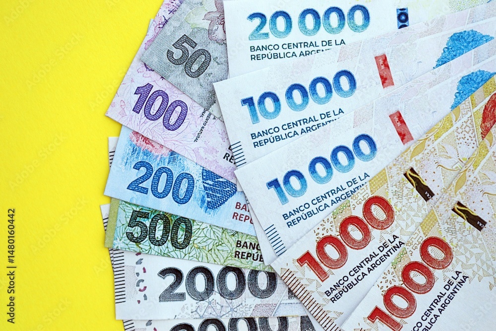 Argentine pesos money bills in big amount lies on yellow color table close up
