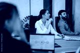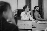A group of diverse business people actively participating in a modern office meeting. The focus is on teamwork, innovation, and collaboration as they discuss strategies and share ideas in a corporate